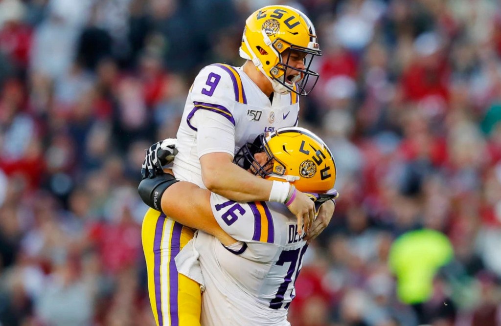 Joe Burrow sprinted toward the LSU fans to celebrate a monumental victory, and moments later was hoisted on the shoulders of two beefy teammates.
