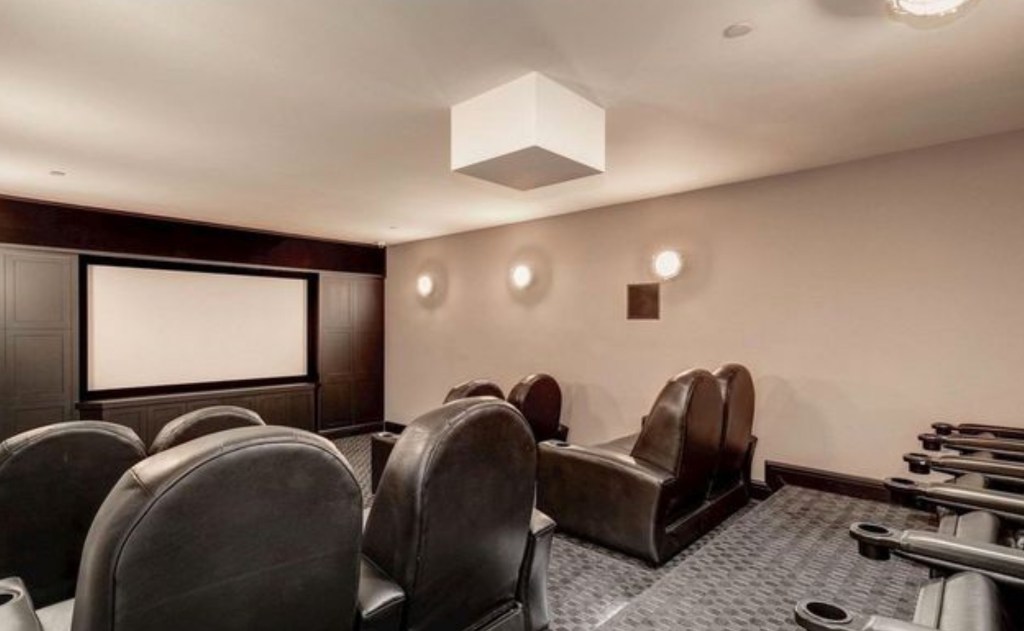 Downstairs, the mansion’s lower level features a fitness center, basketball court, home theater, wine cellar and tasting area, two guest bedrooms, and access to two garages. Access to all four levels is available by elevator or stairs.
