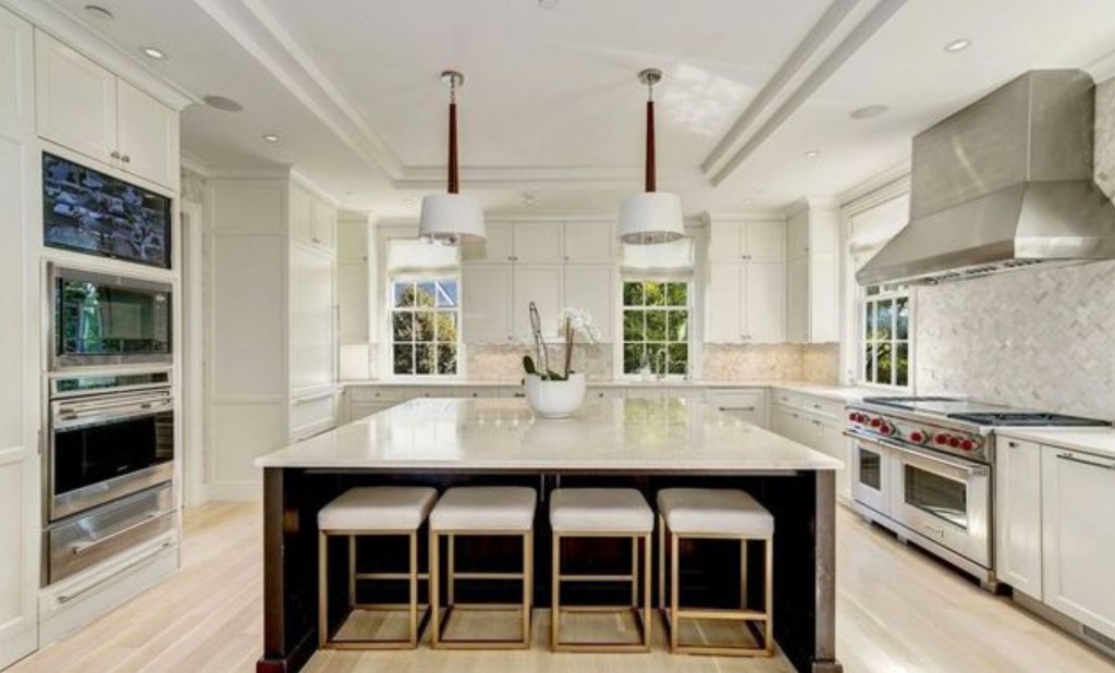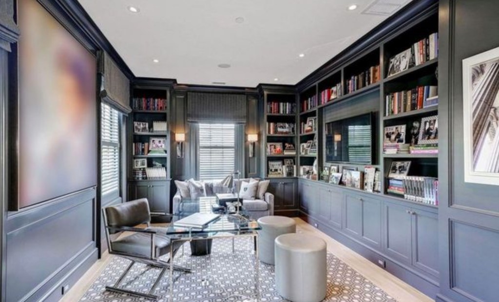 On the second level is a custom library, plus a master suite with walk-in closets. The master’s luxe bathroom comes with a soaking tub and dual-door shower.