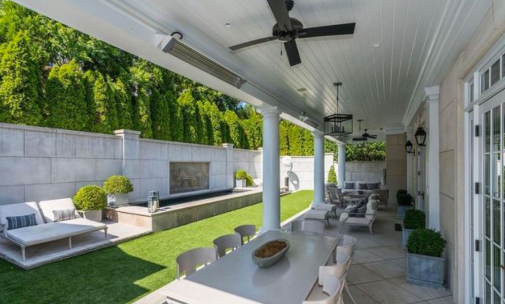 The outdoor space includes a covered patio for dining and lounging, a grassy area, barbecue, and lap pool.