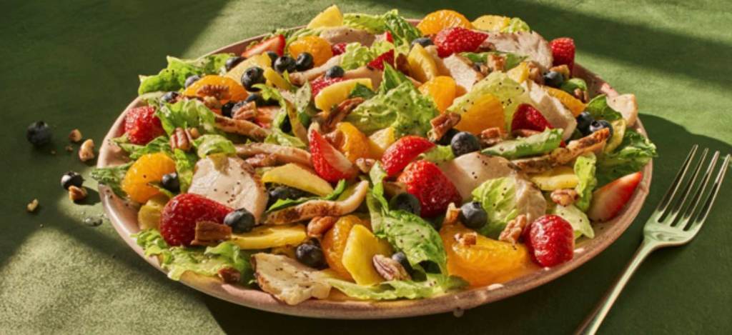 The Strawberry Poppyseed Salad features romaine lettuce, chicken raised without antibiotics, mandarin oranges, fresh strawberries, pineapple and blueberries, tossed with Panera’s poppyseed dressing and topped with roasted pecan pieces.