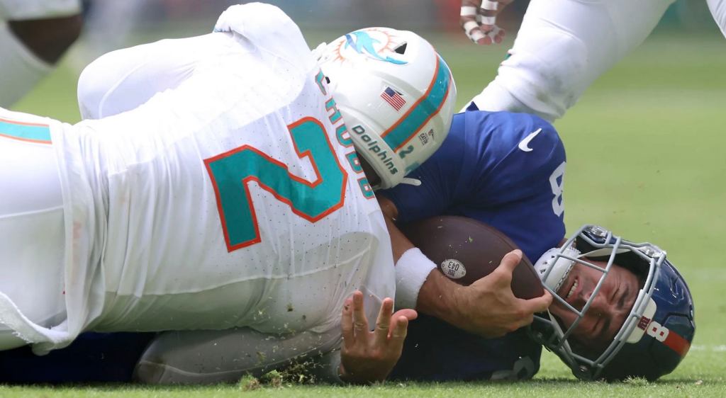 The Giants also lost quarterback Daniel Jones to a neck injury when he was sacked by Andrew Van Ginkel in the fourth quarter. That was the sixth time Jones was sacked on Sunday and the 28th time this season.
