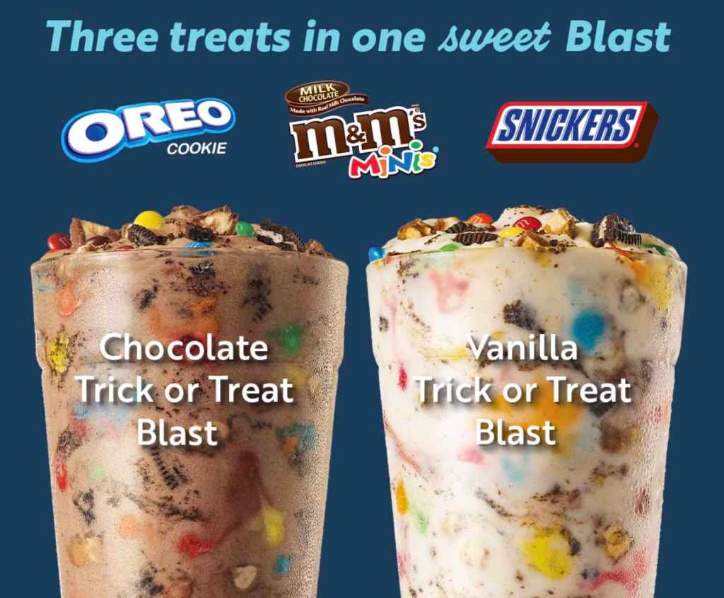- Chocolate Trick or Treat Blast: Vanilla soft serve blended with chocolate syrup, Heath, M&M’s, Minis and Oreo Cookie Pieces.