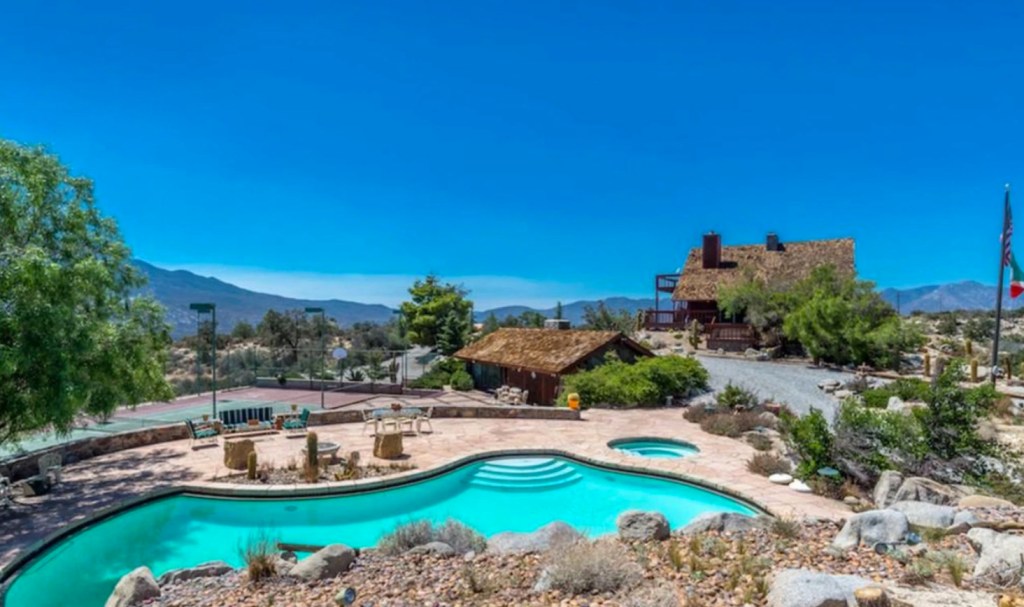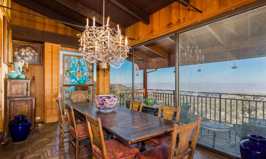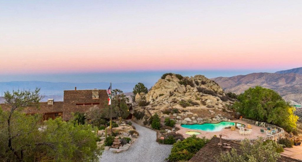 The mid-century mountain retreat is perched high above Palm Desert, and according to the listing, is a “James Bond lair-like compound” that is made up of five bedrooms and six bathrooms. In addition, the property has a separate three-bedroom, five-bathroom guest house and a one-bedroom pool house with two bathrooms and saunas.