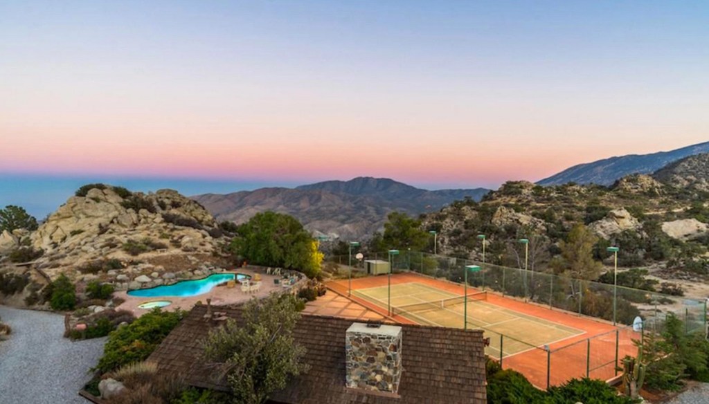Other amenities include a resort-style pool, an expansive backyard with a fire pit, a lighted tennis court, and a helipad.