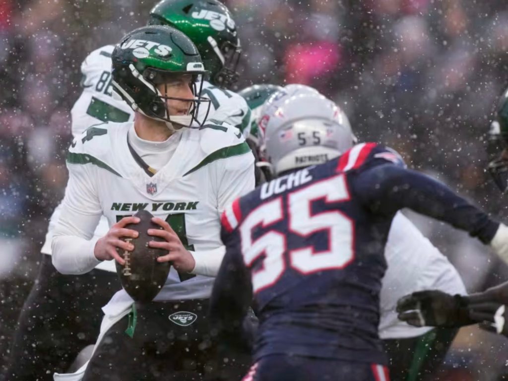 Both the Jets’ 15-game losing streak to the Patriots and their dismal 2023 season came to an end Sunday afternoon in a 17-3 win over New England in game played through heavy snow.