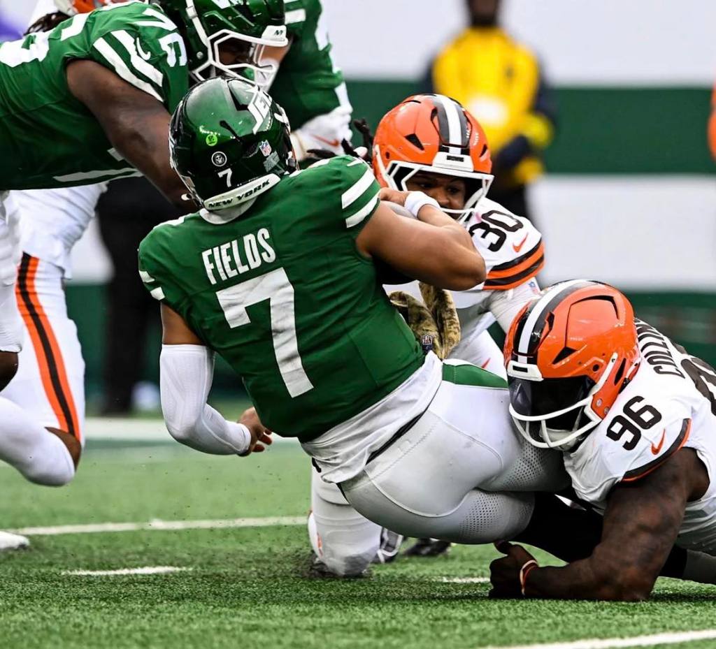 With the Jets leading 27-20, Fields scrambled on third-and-16 and Devin Bush was called for holding, giving New York a first down with 1:50 left at its 44.