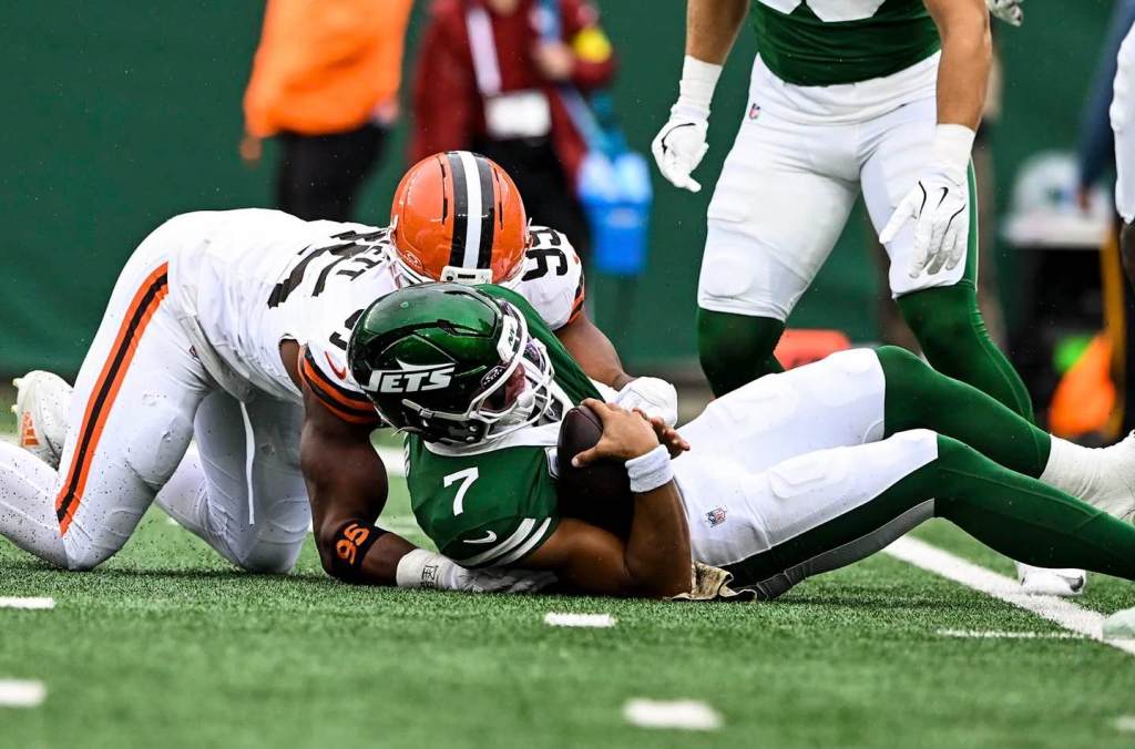 Hall ran three times and the Jets lined up on fourth down to let the play clock run down before planning to call a timeout and punt, but Cleveland’s Cameron Thomas jumped — and New York had a fresh set of downs and the victory.